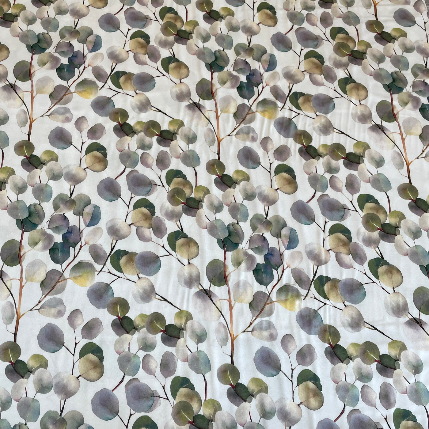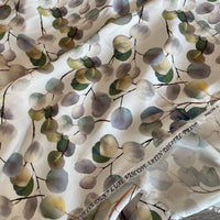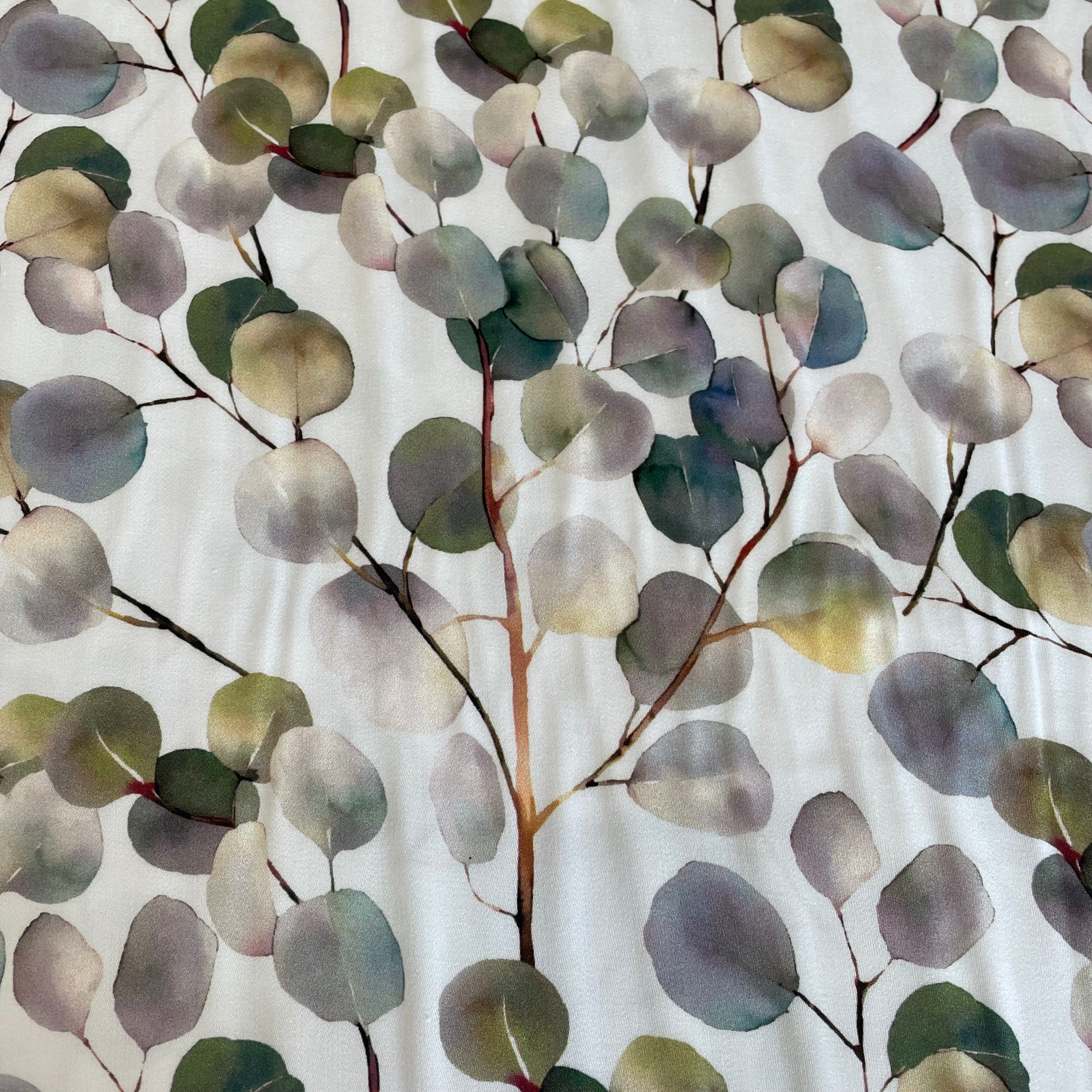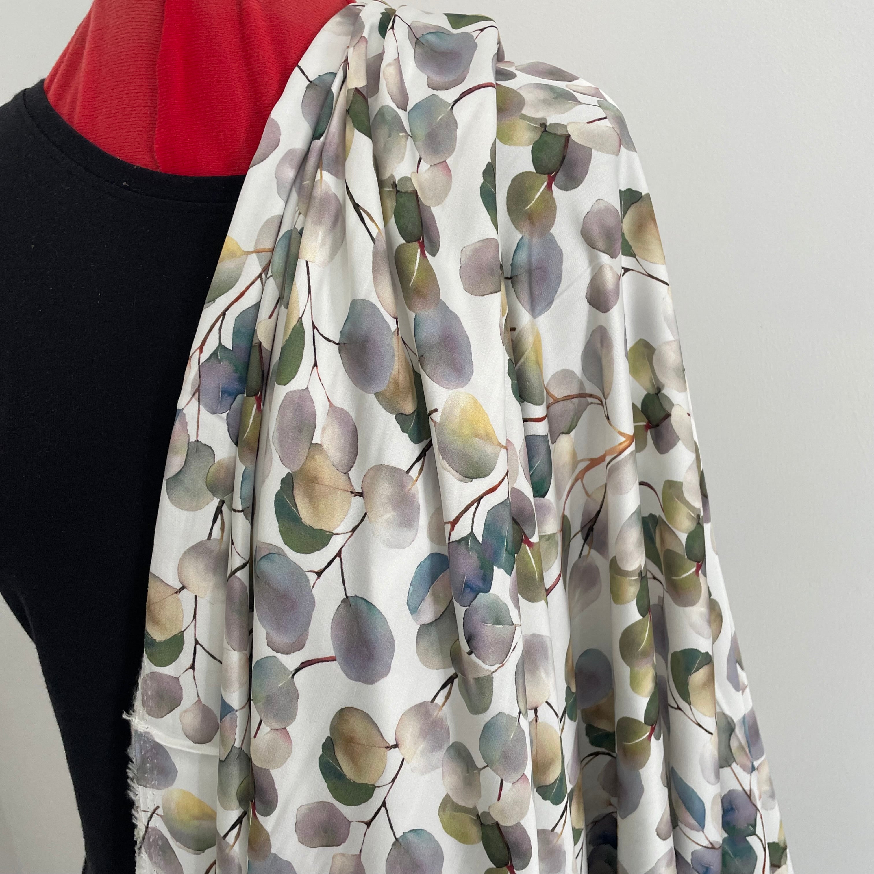 This elegant viscose satin features a soft painterly eucalyptus leaf design in subtle shades of sage, grey, lilac, and olive, scattered across a warm white background. The digital print captures a calming, natural flow, ideal for projects that need movement and a touch of sophistication.