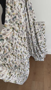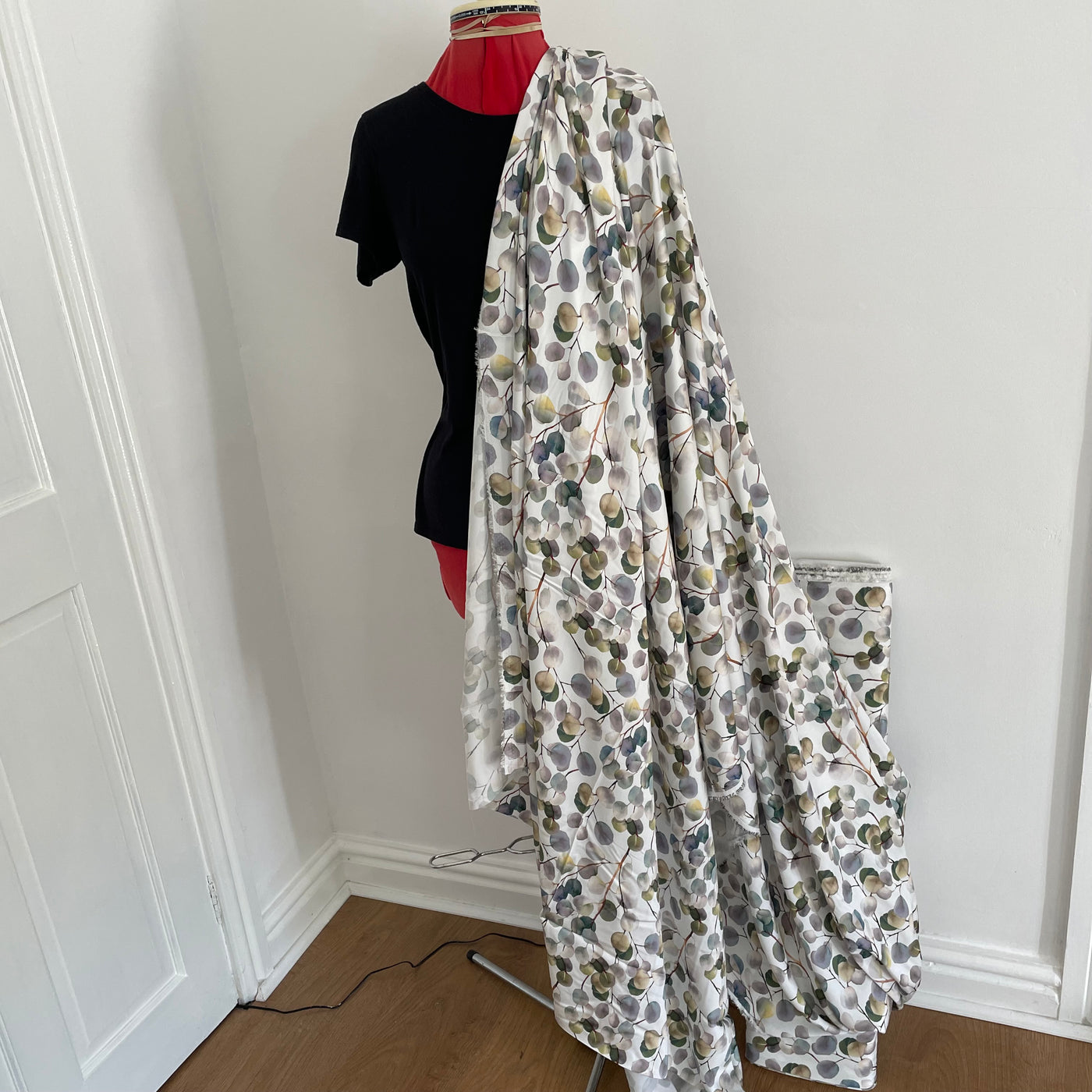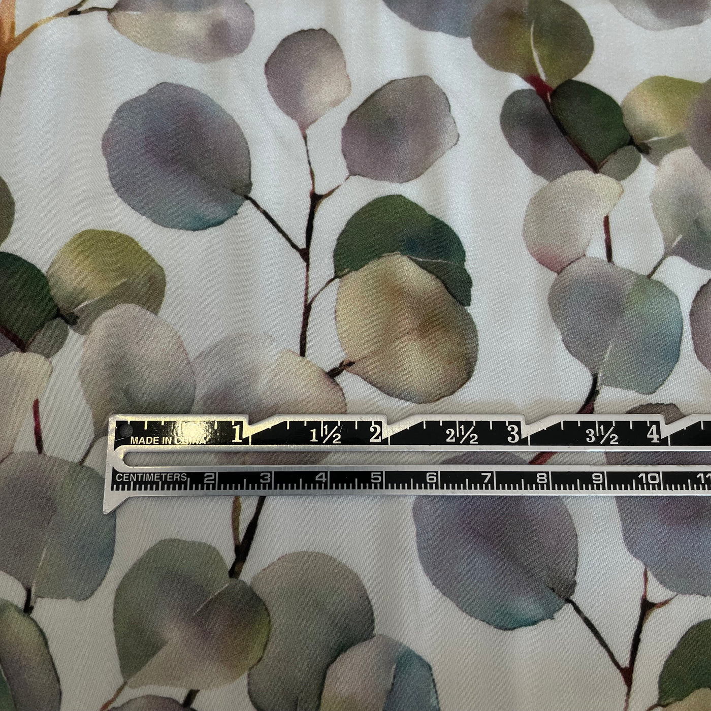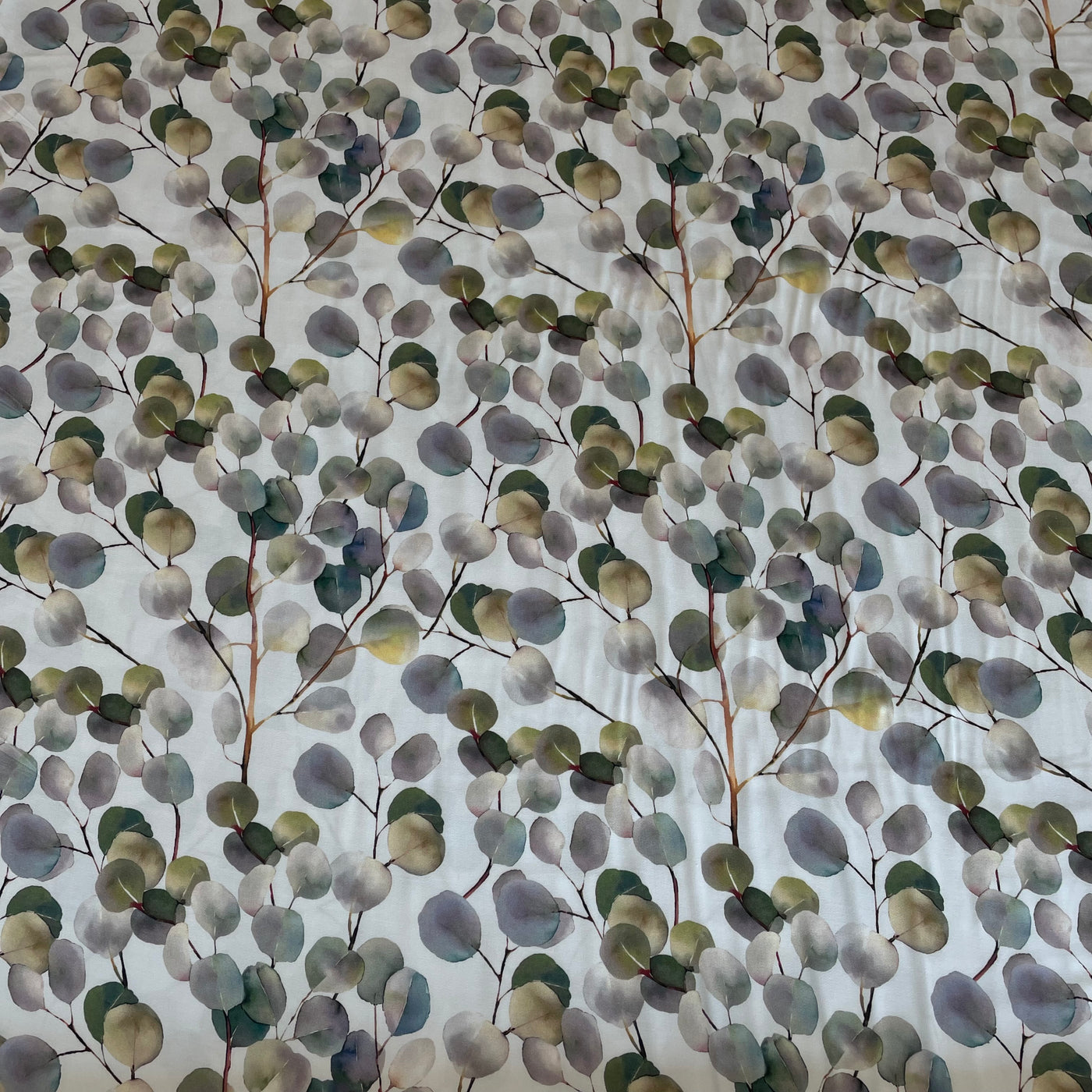 This elegant viscose satin features a soft painterly eucalyptus leaf design in subtle shades of sage, grey, lilac, and olive, scattered across a warm white background. The digital print captures a calming, natural flow, ideal for projects that need movement and a touch of sophistication.